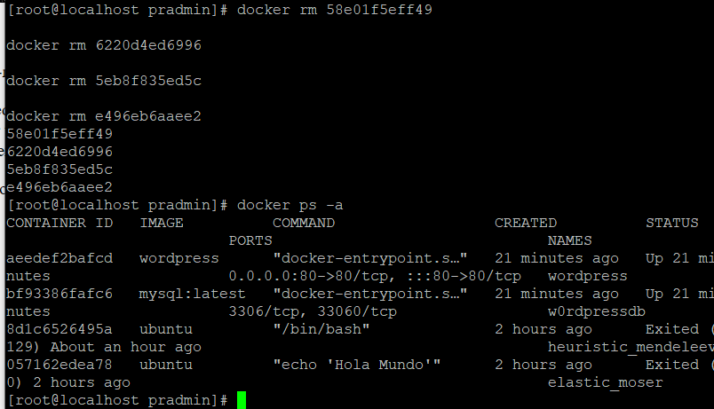 En el ejemplo anterior, había tres contenedores de Docker que fueron eliminados con el comando docker rm.